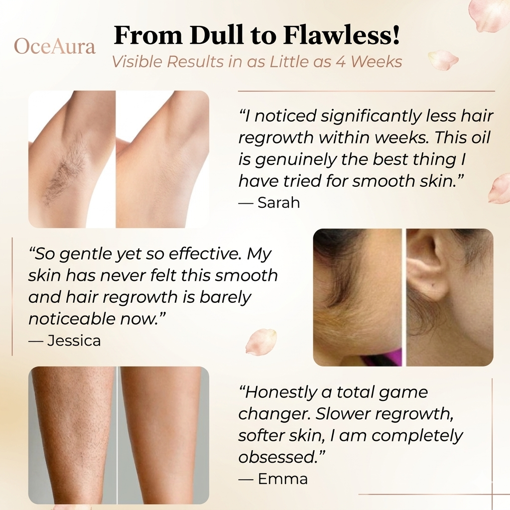 Thousands of women have made OceAura their secret weapon for effortlessly smooth skin. Our clinical trials speak for themselves — this isn't just another body oil. It actively works to reduce the density and speed of hair regrowth with consistent use